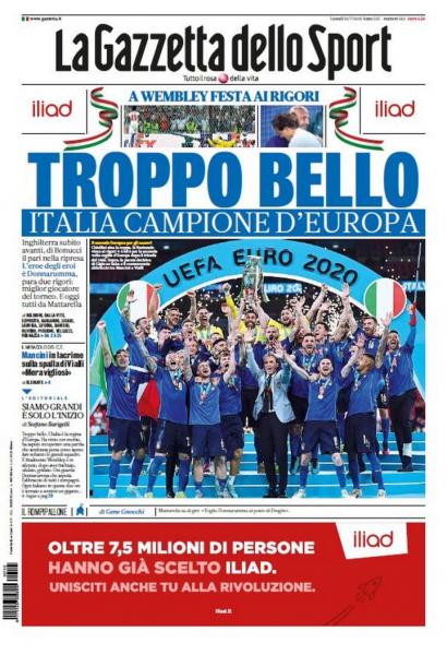 «Είναι δικό μας. Τρελοί ατζούρι στο Γουέμπλει», γράφει στο πρώτο φίλο η «Corriere dello Sport», με την «Gazzetta dello Sport» να έχει τίτλο: «Γιορτή στα πέναλτι στο Γουέμπλεϊ, Πάρα πολύ όμορφο, η Ιταλία πρωταθλήτρια Ευρώπης.
