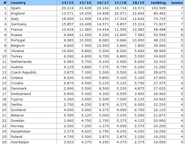 Μετά την ήττα του Ολυμπιακού από την Μπάγερν Μονάχου μείναμε στους 25.300 βαθμούς. Έτσι η Κύπρος με τον ΑΠΟΕΛ ουσιαστικά μας έφτασε. Πήγε στους 25.250 από τη στιγμή που ο τελευταίος πήρε βαθμό στο Μπακού. Έφτασε, μάλιστα, να προηγηθεί με 2-1 της Καραμπάκ, αλλά στη συνέχεια ισοφαρίστηκε.