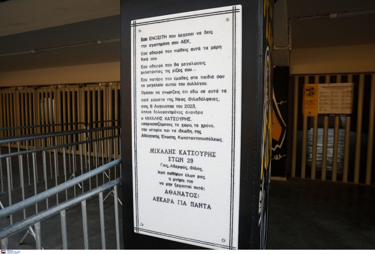 Παράλληλα, στην Opap Arena τοποθετήθηκε συγκινητική επιγραφή για τον Μιχάλη Κατσούρη, έξω από την κερκίδα η οποία πήρε και το όνομά του.