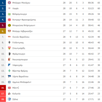 Bundesliga: Η Μπάγερν Μονάχου κόλλησε κόντρα στην Ουνιόν Βερόλινου στο 1-1, με τη Λειψία να πλησιάζει στους 5 βαθμούς. Η Ουνιόν Βερολίνου σταμάτησε το νικηφόρο σερί της Μπάγερν Μονάχου για την 28η αγωνιστική. Η Λειψία διέλυσε εκτός έδρας με 4-1 τη Βέρντερ Βρέμης.
