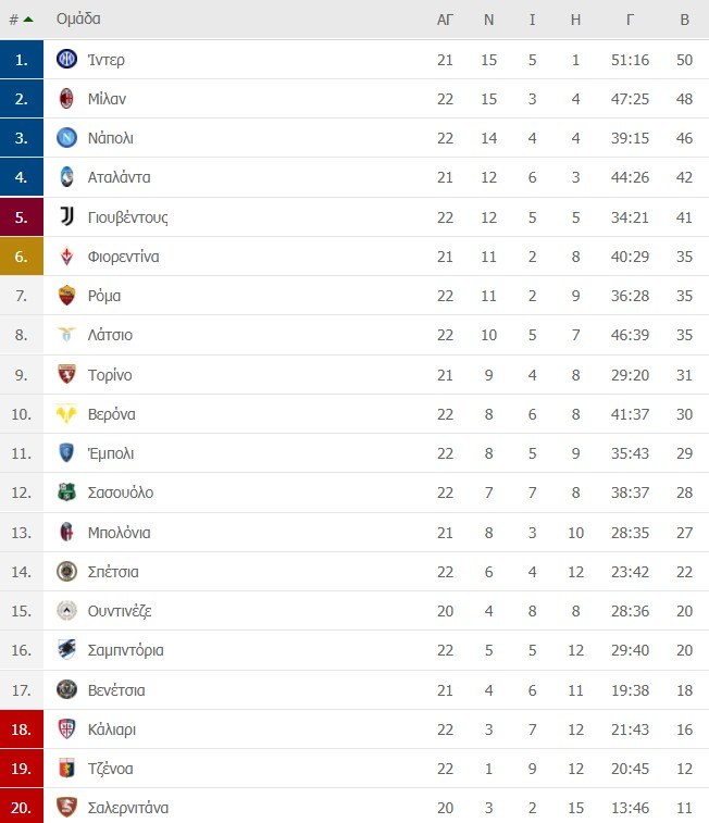 Τα αποτελέσματα και η βαθμολογία της Serie A