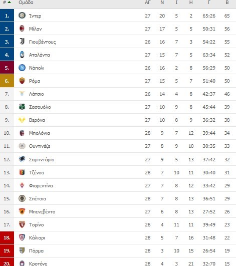 Η 28η αγωνιστική της Serie A συνεχίστηκε με τις αναμετρήσεις Κροτόνε – Μπολόνια και Σπέτσια – Κάλιαρι.