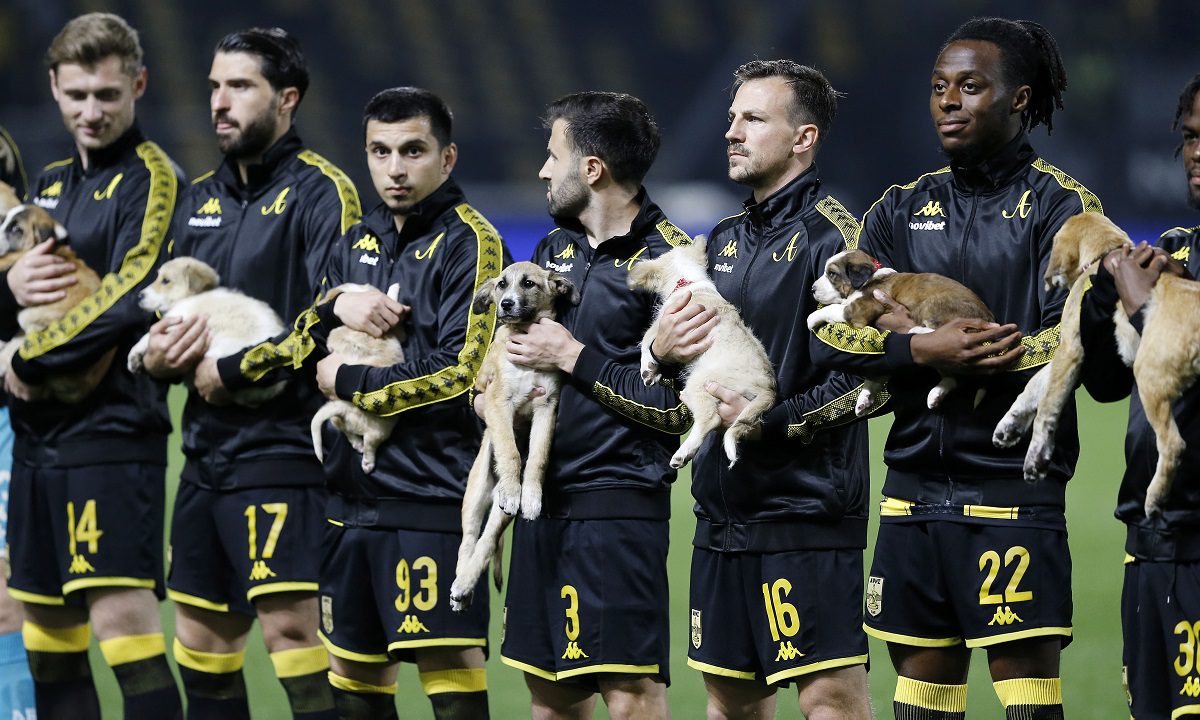 - Οι παίκτες του Άρη εισήλθαν στο γήπεδο κρατώντας ο καθένας από ένα σκυλάκι με σκοπό να περάσουν ένα μήνυμα αγάπης προς τα ζώα.