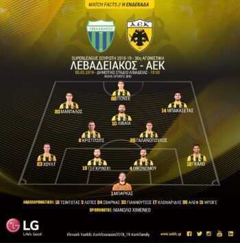 Για τον Λεβαδειακό στο παιχνίδι με την ΑΕΚ ξεκινούν το ματς βασικοί οι: Μπάγιτς, Αντιλέχου, Χατζηλάμπρος, Ρεκιασβίλι, Λιάγκας, Κονέ, Ζησόπουλος, Παντελιάδης, Μαρκόφσκι, Νάνγκις, Νίκας. Στον πάγκο οι: Ζωγράφος, Σουλαϊμον, Καραχάλιος, Μέλεγκ, Ιωαννίδης, Μητρόπουλος, Τσαμπούρης.