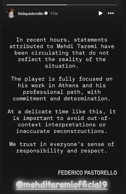 Ο ατζέντης του Ταρέμι, Φεντερίκο Παστορέλο με ανάρτησή του στα σόσιαλ, τοποθετήθηκε και εκείνος για το θέμα