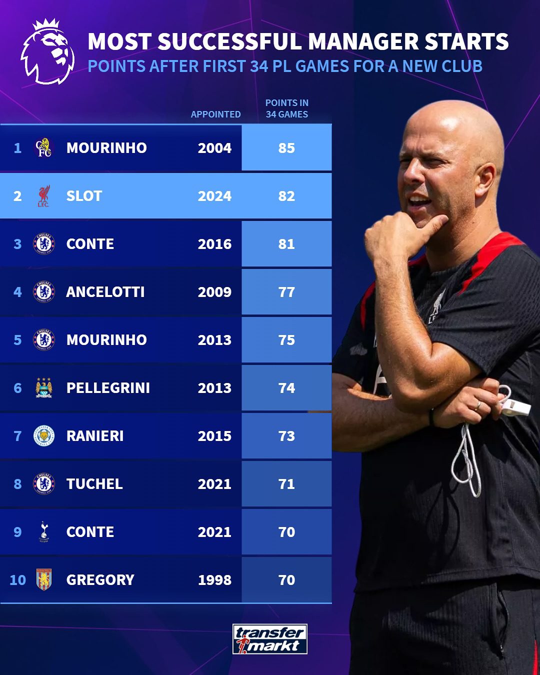 Μετά από 34 αγωνιστικές, η Λίβερπουλ του Σλοτ έχει συγκεντρώσει 82 βαθμούς, επίδοση που τον φέρνει δεύτερο στη λίστα με τα πιο πετυχημένα ξεκινήματα προπονητών στην ιστορία της Premier League.