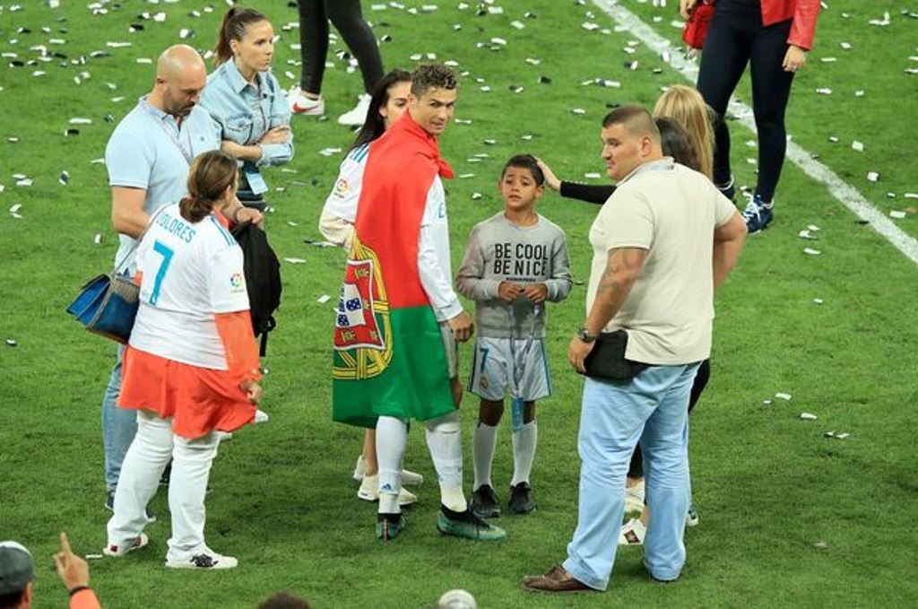 Ο Κριστιάνο Ρονάλντο προσέλαβε τους δύο άνδρες για τον τελικό του Champions League στο Κίεβο, οι οποίοι πρέπει να σημειώσουμε ότι τον ακολουθούσαν σε κάθε του βήμα στην ουκρανική πρωτεύουσα όλες τις ώρες της μέρας, ενώ ήταν μαζί του ακόμη και μέσα στο γήπεδο, κατά τη διάρκεια των πανηγυρισμών με τη Χόρχινα και το γιο του, όπως μπορείτε να δείτε στην παρακάτω φωτογραφία.