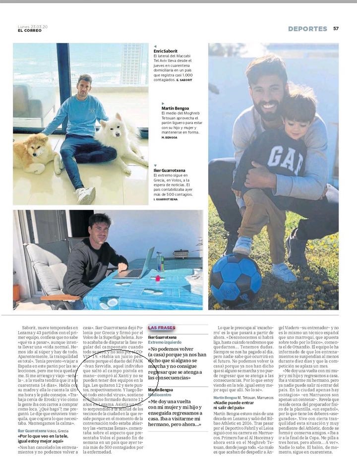 Δεν ξέρουμε αν θα υπάρξει πρωτάθλημα και πόσο καιρό θα πρέπει να περιμένουμε. Έχουμε αμφιβολίες. Πάντως έχουμε πληρωθεί μέχρι σήμερα, αλλά κανείς δεν ξέρει τι θα συμβεί στο μέλλον. Δεν μπορούμε να επιστρέψουμε (σ.σ. στην Ισπανία), γιατί μας έχουν πει πως αν κάποιος φύγει και δεν μπορεί να επιστρέψει, θα υποστεί τις συνέπειες. Από όσα βλέπω στην τηλεόραση, είμαι καλύτερα εδώ παρά στην πατρίδα. Δεν ξέρω».