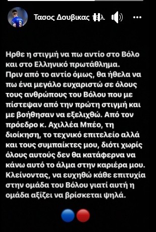 Λίγο μετά την οριστική συμφωνία του Βόλου με την Ολλανδική Ουτρέχτη για τη μεταγραφή του Τάσου Δουβίκα, ο 21χρονος επιθετικός μέσω των social media ευχαρίστησε όλους όσοι τον βοήθησαν να κάνει το άλμα στην καριέρα του, ξεκινώντας φυσικά από τον Αχιλλέα Μπέο, ο οποίος ήταν ο άνθρωπος που τον έφερε στην ομάδα και κυρίως τον πίστεψε.