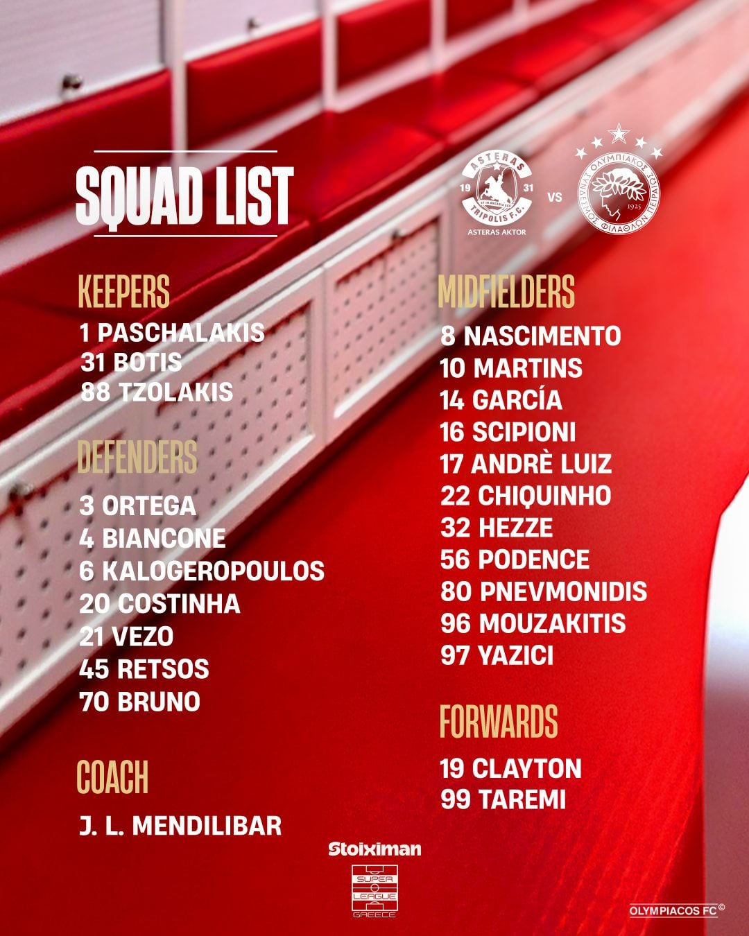 Ανακοίνωσε την αποστολή για την αναμέτρηση με τον Αστέρα Τρίπολης ο Ολυμπιακός. Λείπει από αυτή ο Ροντινέι, μέσα είναι όμως ο Κλέιτον.