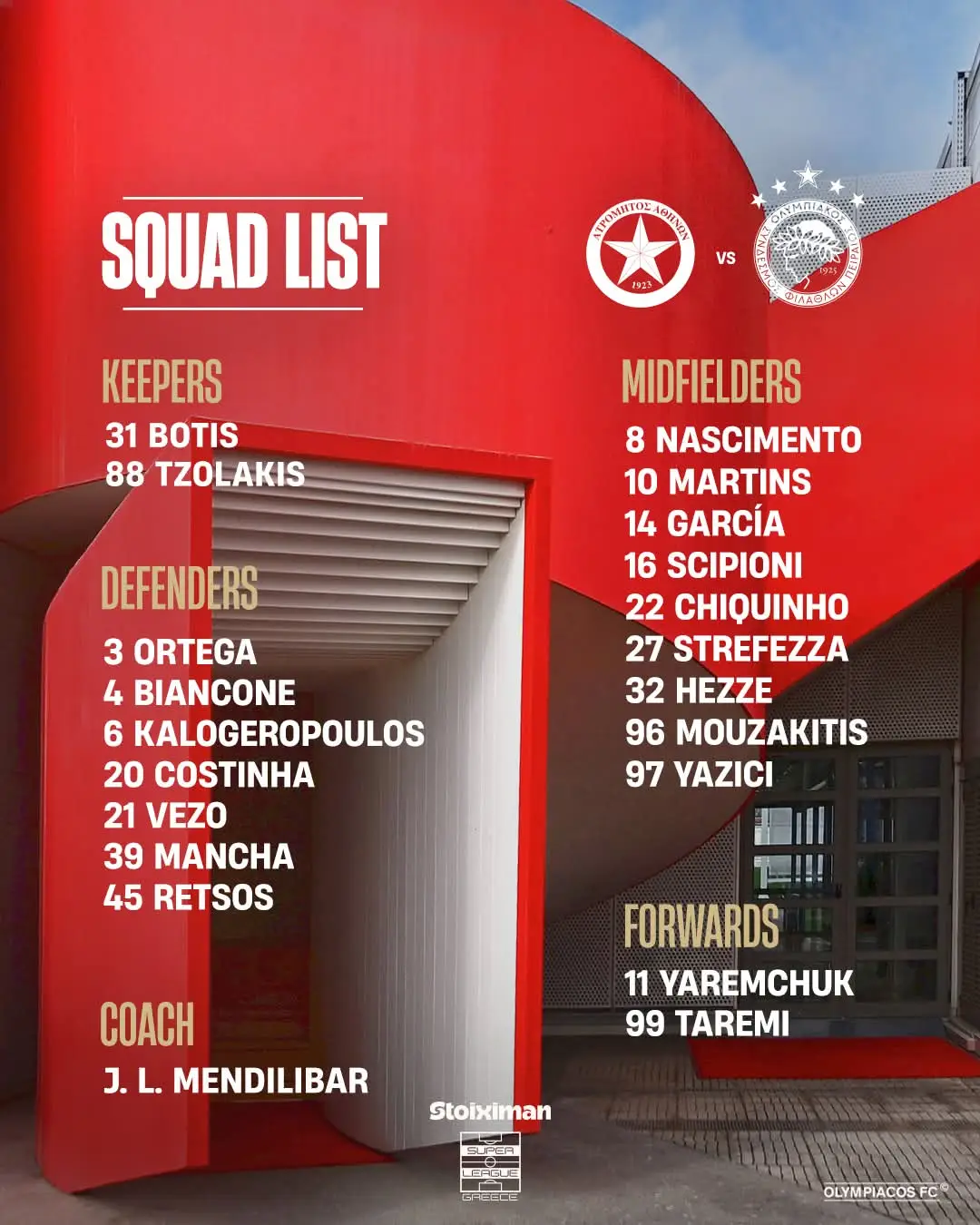 Ο Ροντινέι έμεινε εκτός με ίωση. Ο Ποντένσε το ίδιο αλλά με πρόβλημα στο πόδι. Ο Ελ Κααμπί όπως είναι γνωστό είναι στο Κύπελλο Εθνών Αφρικής. Ο Ολυμπιακός δεν έχει και τον τραυματία Πιρόλα.