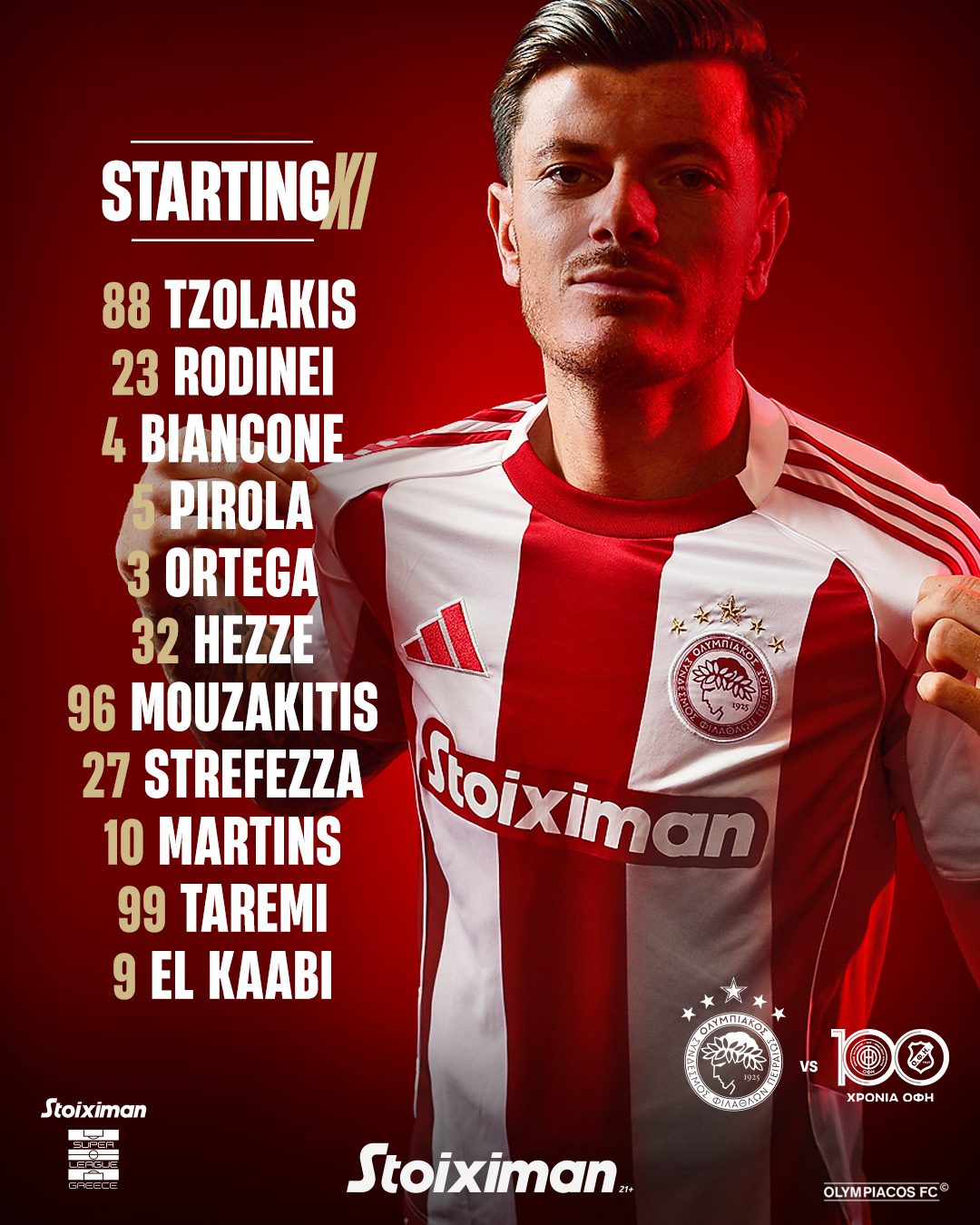 Ο Τζολάκης θα είναι κάτω από τα δοκάρια. Δεξιά στην άμυνα ο Ροντινεί και αριστερά ο Ορτέγκα. Τα δύο στόπερ είναι ο Πιρόλα και ο Μπιανκόν.