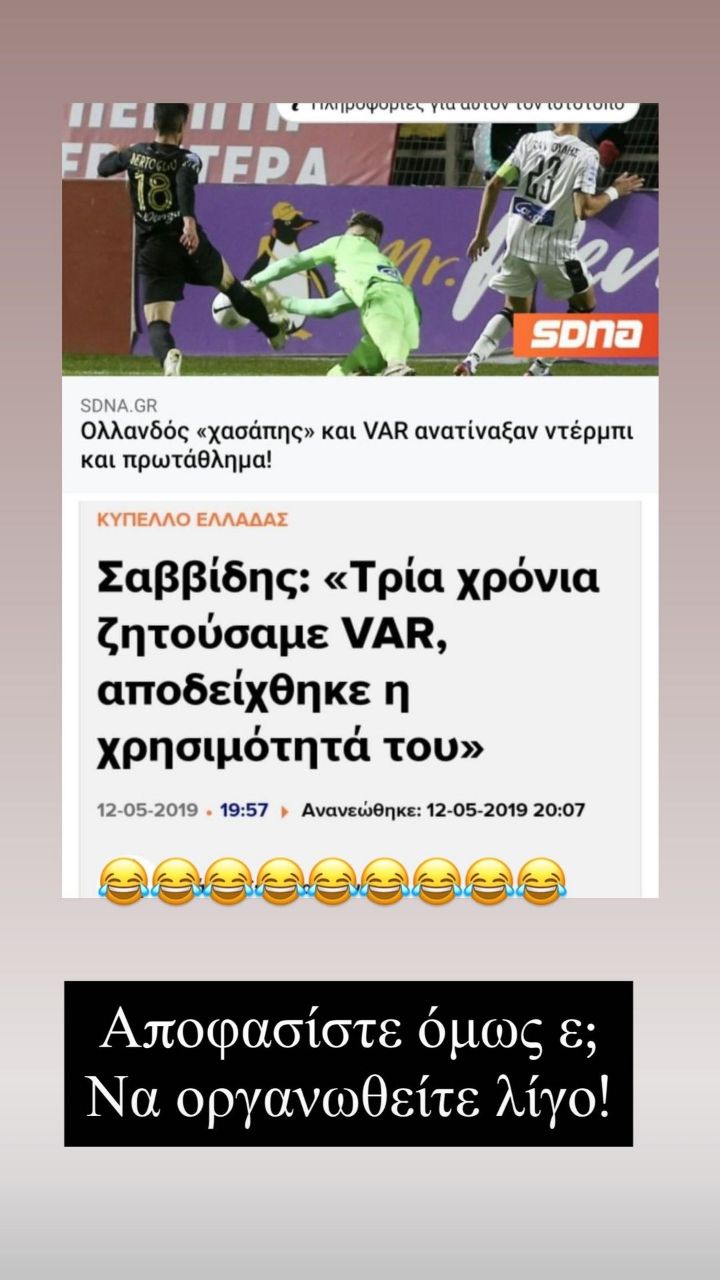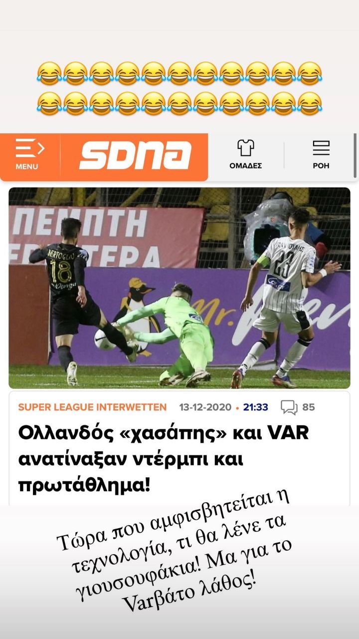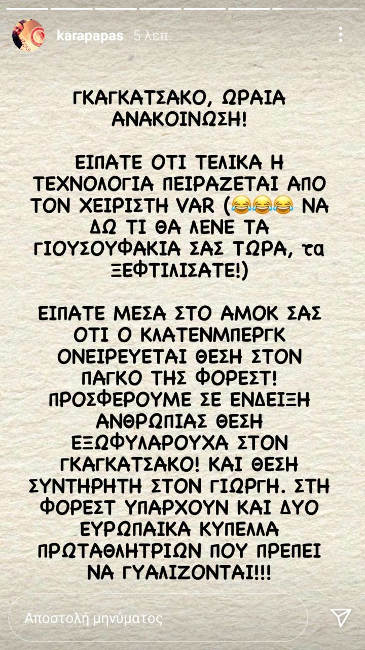 «Γκαγκατσάκο ωραία ανακοίνωση. Είπατε ότι τελικά η τεχνολογία πειράζεται από τον χειριστή VAR. Είπατε μέσα στο αμόκ σας ότι ο Κλάτενμπεργκ ονειρεύεται θέση στον πάγκο της Φόρεστ. Προσφέρουμε σε ένδειξη ανθρωπιάς θέση εξωφυλαρούχα στον Γκαγκατσάκο. Και θέση συντηρητή στον Γιώργη. Στη Φόρεστ υπάρχουν και δύο ευρωπαίκά κύπελλα που πρέπει να γυαλίζονται» αναφέρει ο Κώστας Καραπαπάς στην ανάρτηση του.