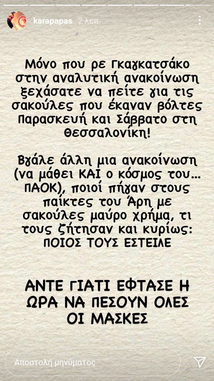 Και έπειτα… βάζει φωτιές: «Μόνο ρε Γκαγκατσάκο στην αναλυτική ανακοίνωση ξεχάσατε για τις σακούλες που έκαναν βόλτες την Παρασκευή στη Θεσσαλονίκη. Βγάλε άλλη μια ανακοίνωση να μάθει και ο κόσμος του ΠΑΟΚ ποιοι πήγαν στους παίκτες του ΑΡΗ με σακούλες μαύρο χρήμα. Το τους ζήτησαν και κυρίως ποιος τους έστειλε. Άντε γιατί έφτασε η ώρα να πέσουν όλες οι μάσκες», ήταν η αιχμηρή τοποθέτηση που έκανε ο Κώστας Καραπαπάς την οποία μπορείτε να δείτε παρακάτω.
