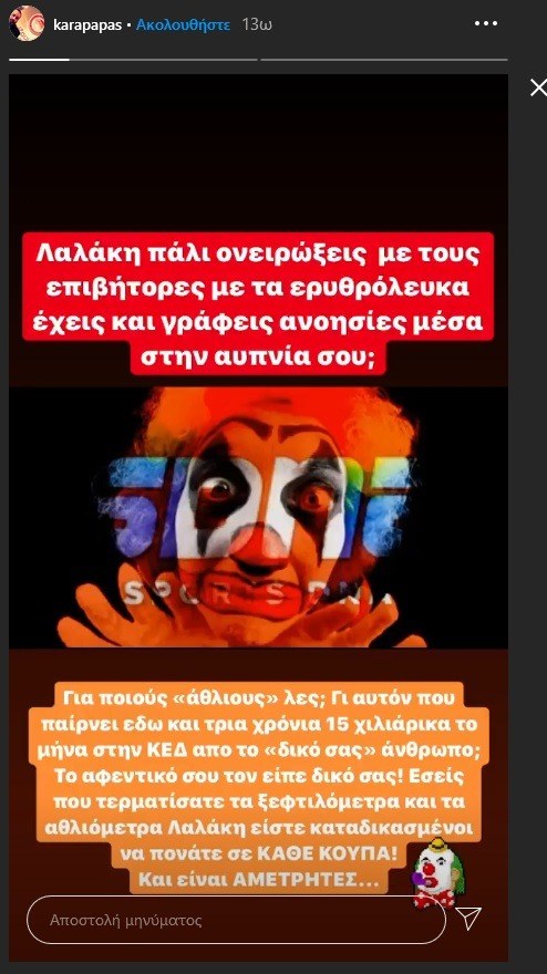 Ο Κώστας Καραπαπάς με δημοσίευσή του στον λογαριασμό του στο Instagram, καταφέρθηκε κατά του δημοσιογράφου Βασίλη Παπαθεοδώρου και της ιστοσελίδας SDNA.