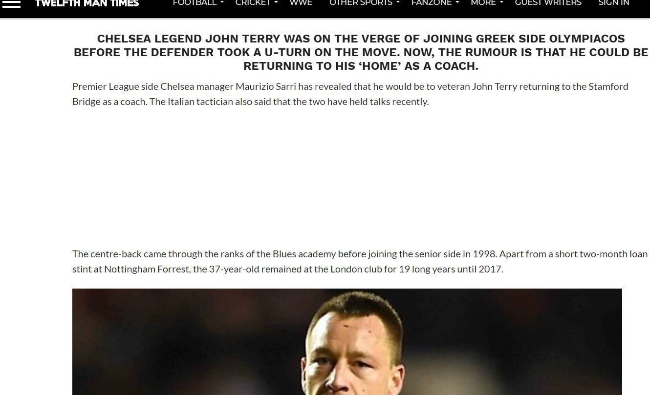 «Στο τέλος της σεζόν 2016/17 ο Τέρι αποχαιρέτησε την ομάδα του και εντάχθηκε στην Άστον Βίλα, ομάδα της Τσάμπιονσιπ με ελεύθερη μεταγραφή. Ένα χρόνο αργότερα άφησε τους Βίλανς και ήταν στα πρόθυρα να ενταχθεί στον Ολυμπιακό. Ο θρύλος της Τσέλσι, μάλιστα, πέρασε και ιατρικές εξετάσεις στην ελληνική ομάδα, αλλά αποφάσισε να μην υπογράψει την τελευταία στιγμή. Τώρα το μέλλον του παραμένει αβέβαιο, καθώς έχει μία προσφορά από την Άστον Βίλα και μία πρόταση να αναλάβει ρόλο προπονητή στην Τσέλσι» αναφέρει χαρακτηριστικά το δημοσίευμα, που φιλοξενεί και μία δήλωση του Μαουρίτσιο Σάρι.
