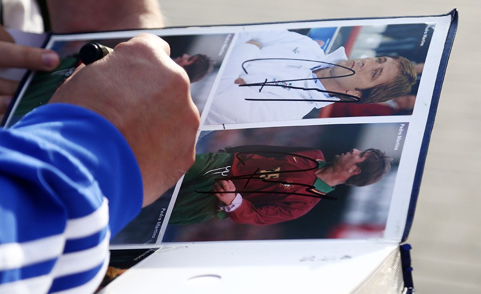 Δείτε φωτογραφίες από τη στιγμή που ο Πέδρο Μαρτίνς υπέγραψε αυτόγραφο σε φωτογραφία του από την εποχή που ήταν ποδοσφαιριστής.