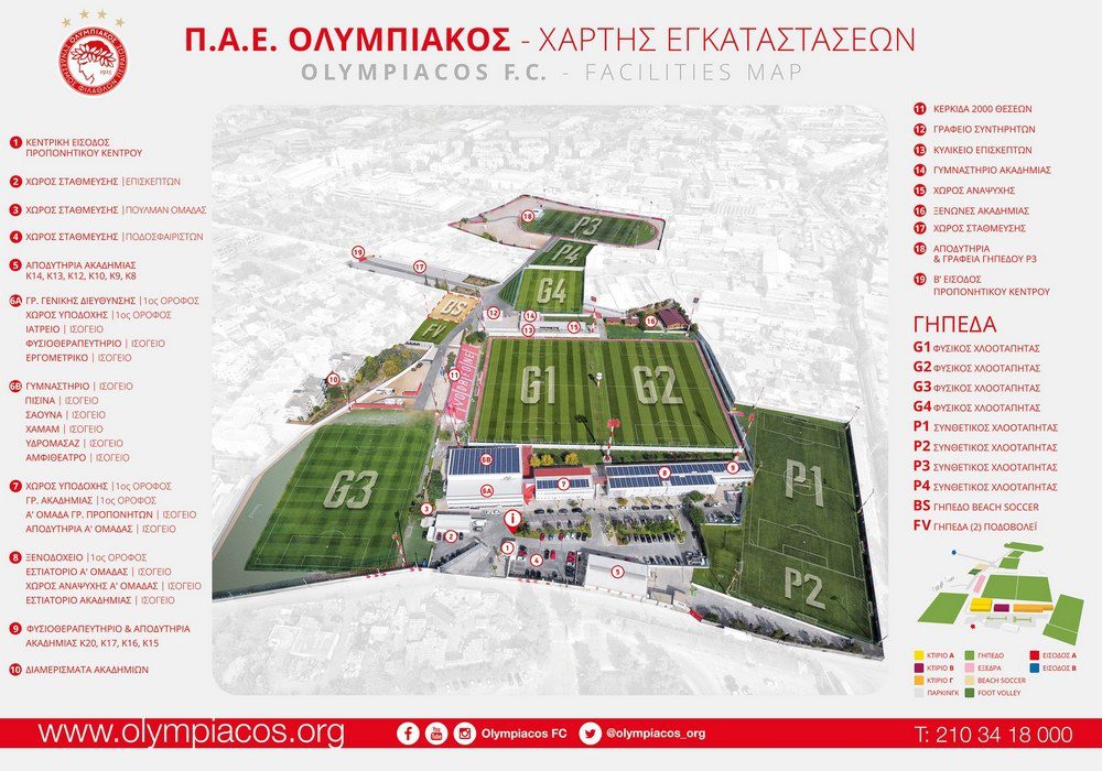 *Το 2010 επί προεδρίας Βαγγέλη Μαρινάκη το Προπονητικό Κέντρο επεκτάθηκε με τις κατασκευές νέων γηπέδων και ξενώνων και εκσυγχρονίζεται κάθε χρόνο. Σήμερα, καλύπτει έκταση 100 στρεμμάτων!