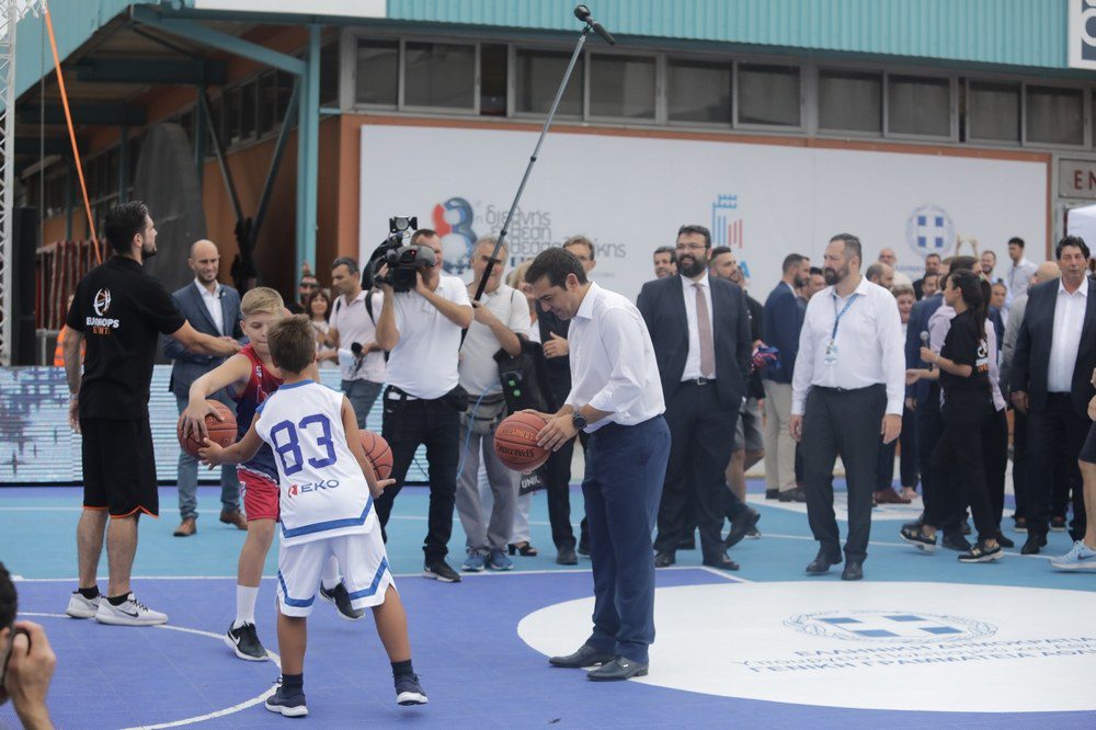 Ο Αλέξης Τσίπρας περιηγήθηκε, το Σάββατο (8/9), στο περίπτερο της Γενικής Γραμματείας Αθλητισμού στη ΔΕΘ, συνοδεία του υφυπουργού Αθλητισμού, Γιώργου Βασιλειάδη. Όταν σταμάτησε σε ένα μικρό γήπεδο, όπου παιδιά έπαιζαν μπάσκετ, συνομίλησε με δύο πιτσιρικάδες, 11 και 12 ετών από τον Εύοσμο, που φορούσαν τη φανέλα της Εθνικής Ελλάδος και των ΗΠΑ. Τα δύο παιδιά αγωνίζονται στην Ακαδημία μπάσκετ «10», η οποία ανήκει στον παλαίμαχο μπασκετμπολίστα Νίκο Χατζηβρέττα.