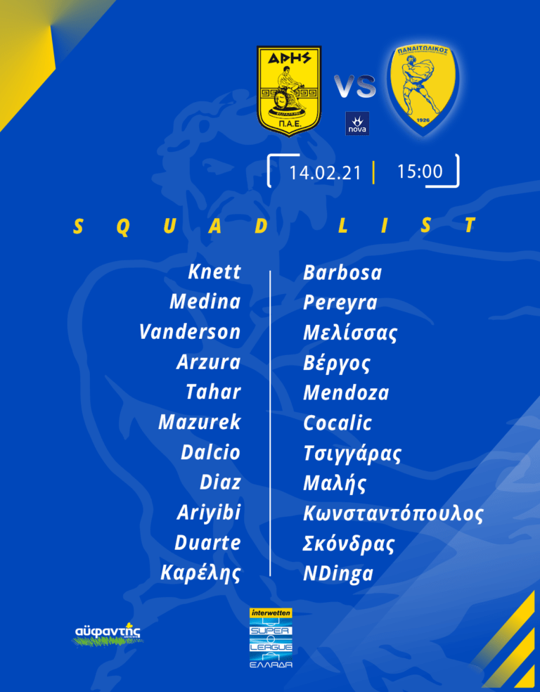 Παναιτωλικός: Στην αποστολή για τον αγώνα με τον Άρη συμμετέχουν οι ποδοσφαιριστές: Κνετ, Μεντίνα, Βάντερσον, Αρσούρα, Ταχάρ, Μάζουρεκ, Ντάλσιο, Ντίας, Αριγίμπι, Ντουάρτε, Καρέλης, Μπαρμπόσα, Περέιρα, Μελίσσας, Βέργος, Μεντόσα, Τσότσαλιτς, Τσιγγάρας, Μαλής, Κωνσταντόπουλος, Σκόνδρας, Εντινγκά.