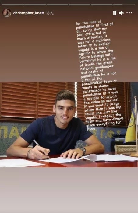 Με ανάρτησή του στα κοινωνικά δίκτυα ο τερματοφύλακας του Παναιτωλικού Κρίστοφερ Κνετ απολογήθηκε για το περιστατικό που σχολιάστηκε ποικιλοτρόπως.