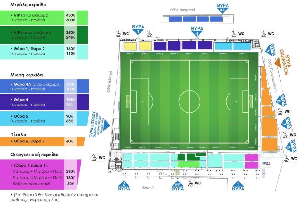 Για την προμήθεια του εισιτηρίου διαρκείας απαιτείται Αστυνομική ταυτότητα και ΑΜΚΑ. Υπάρχει η δυνατότητα ηλεκτρονικής αγοράς του εισιτηρίου διαρκείας (όπως και των απλών εισιτηρίων στη συνέχεια) μέσω του VIVA.gr από την Τρίτη 10 Ιουλίου, κάθε ημέρα και ώρα. Είναι διαθέσιμες όλες οι ελεύθερες θέσεις, εκτός της Οικογενειακής κερκίδας Τμήμα 1 στη Θύρα 1 και της Θύρας 3.