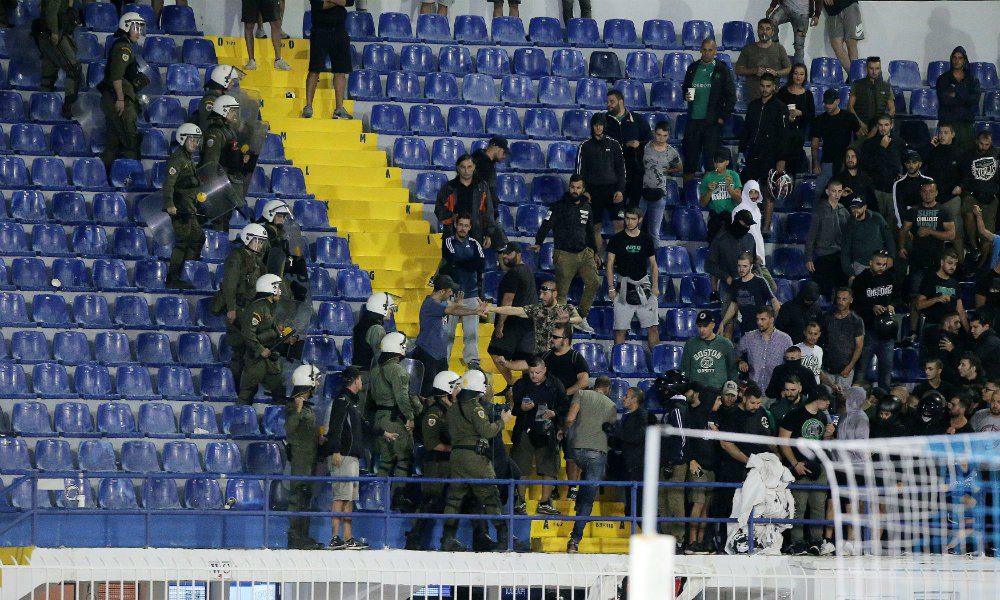 Το ματς διεκόπη για 5 λεπτά, με τις δυνάμεις των ΜΑΤ να μπαίνουν στη Θύρα 5 όπου φιλοξενούνταν οι φίλοι του Παναθηναϊκού, με την ένταση τότε να εκτονώνεται.