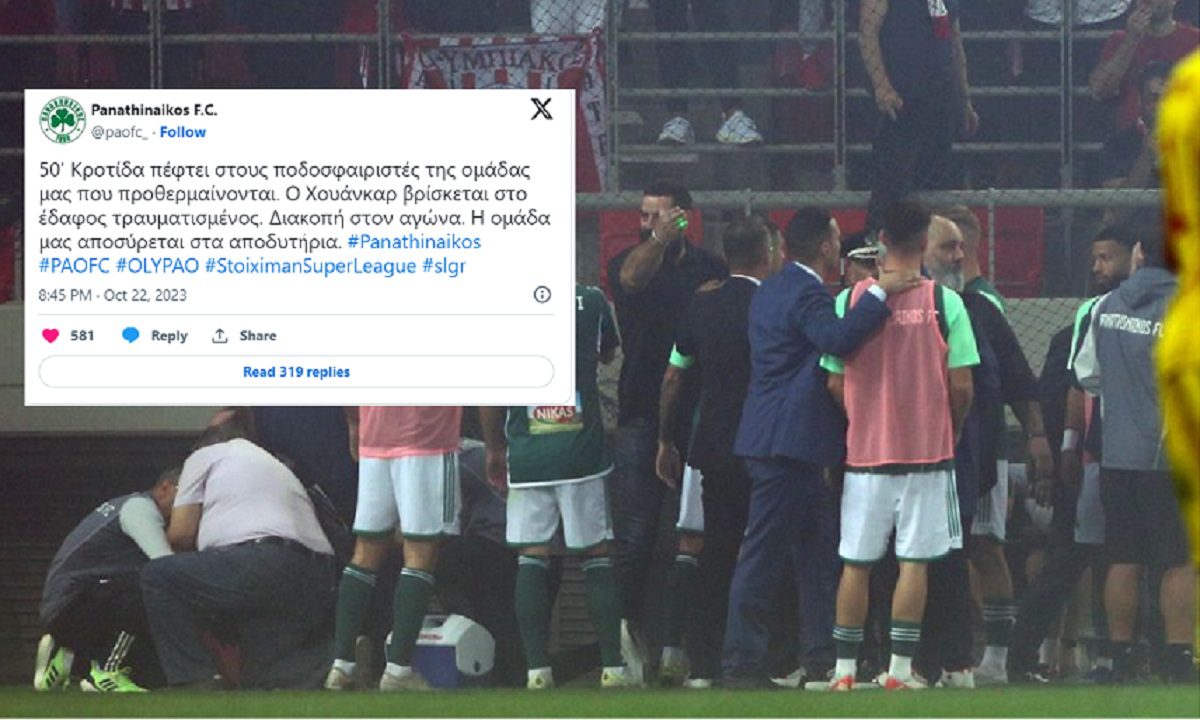 Παναθηναϊκός: Διακοπή στον αγώνα έγραψε η ΠΑΕ μετά τον τραυματισμό, η «ομάδα μας αποσύρεται στα αποδυτήρια», σημείωσαν οι «πράσινοι».