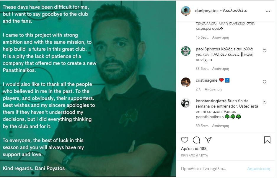 Από τη στιγμή που απολύθηκε από τον Παναθηναϊκό ο Ντάνι Πογιάτος, δεν βγήκε δημόσια να μιλήσει. Το Σάββατο (17/10), όμως, πήρε θέση μέσω ποσταρίσματός του στο Instagram. Όποιος διαβάσει τα όσα έγραψε, θα καταλάβει πως αφήνει αιχμές για τη διοίκηση και την έλλειψη υπομονής -που κατά τη γνώμη του- έδωσε.