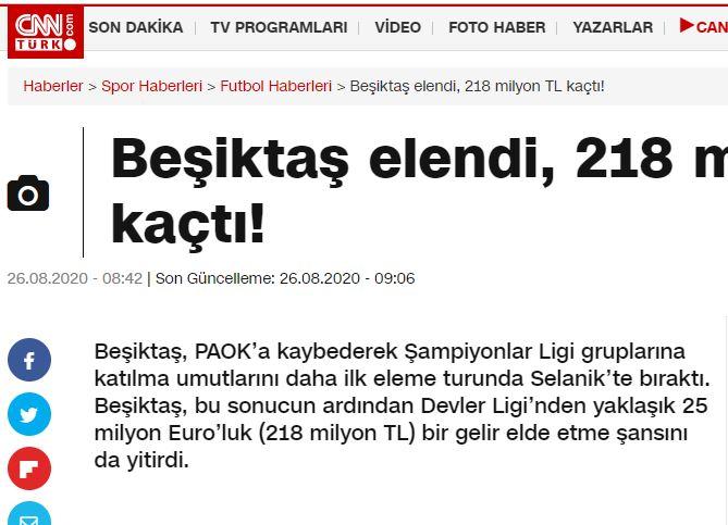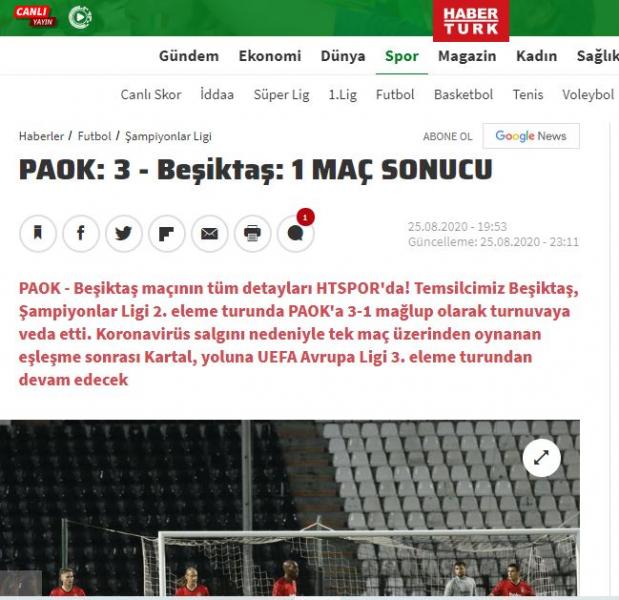 «Η Μπεσίκτας κατέρρευσε. 218 εκατομμύρια λίρες έγιναν ατμός. Η Μπεσίκτας έχασε από τον ΠΑΟΚ και απώλεσε τις ελπίδες της για να συνεχίσει στον τρίτο προκριματικό γύρο του Champions League. Έχασε έτσι και τις ελπίδες της για να κερδίσει περίπου 25 εκατομμύρια ευρώ (218 εκατομμύρια τουρκικές λίρες) από την κορυφαία διοργάνωση».