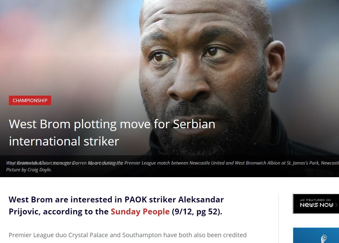 Οι Άγγλοι τονίζουν πως αν αφήσει τον ΠΑΟΚ, οι πιθανότητες είναι να επιστρέψει στην Αγγλία όπου αρκετοί σύλλογοι τον παρακολουθούν, με τον ηγέτη της Γουεστ Μπρομ, Ντάρεν Μουρ, να κυνηγά επιθετική ενίσχυση για την ομάδα και να σκέφτεται σοβαρά τον 28χρονο Σέρβο.