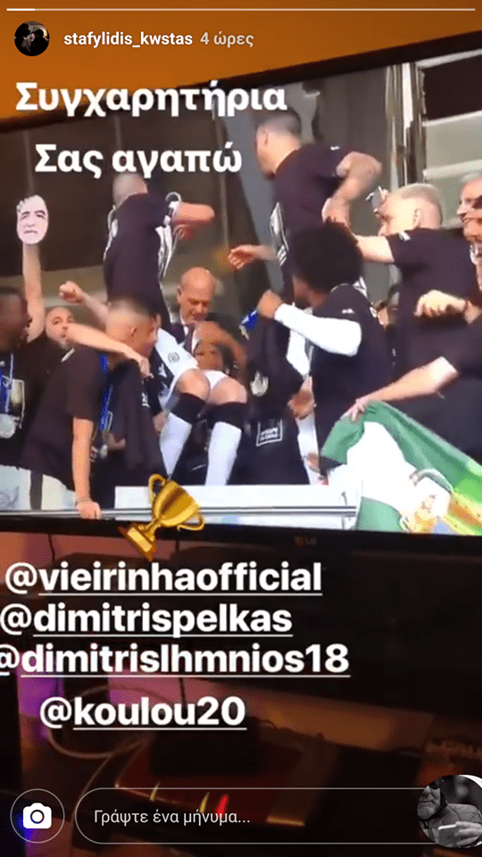 Ο 24χρονος πόσταρε μία φωτογραφία από την απονομή του τροπαίου και τάγκαρε σε αυτήν τους Βιεϊρίνια, Πέλκα, Λημνιό και Κουλούρη γράφοντας παράλληλα: «Συγχαρητήρια, σας αγαπώ».
