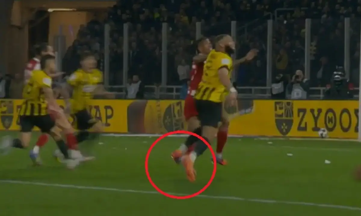 Στην επίμαχη φάση του ΑΕΚ – Ολυμπιακός, απ’ όπου προήλθε και η ισοφάριση των «ερυθρόλευκων» υπάρχει επαφή χαμηλά στο πόδι του Αντρέ Λουίζ που προκαλεί απώλεια ισορροπίας του παίκτη του Ολυμπιακού.