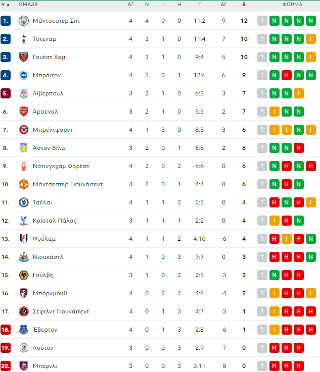 Η βαθμολογία της Premier League