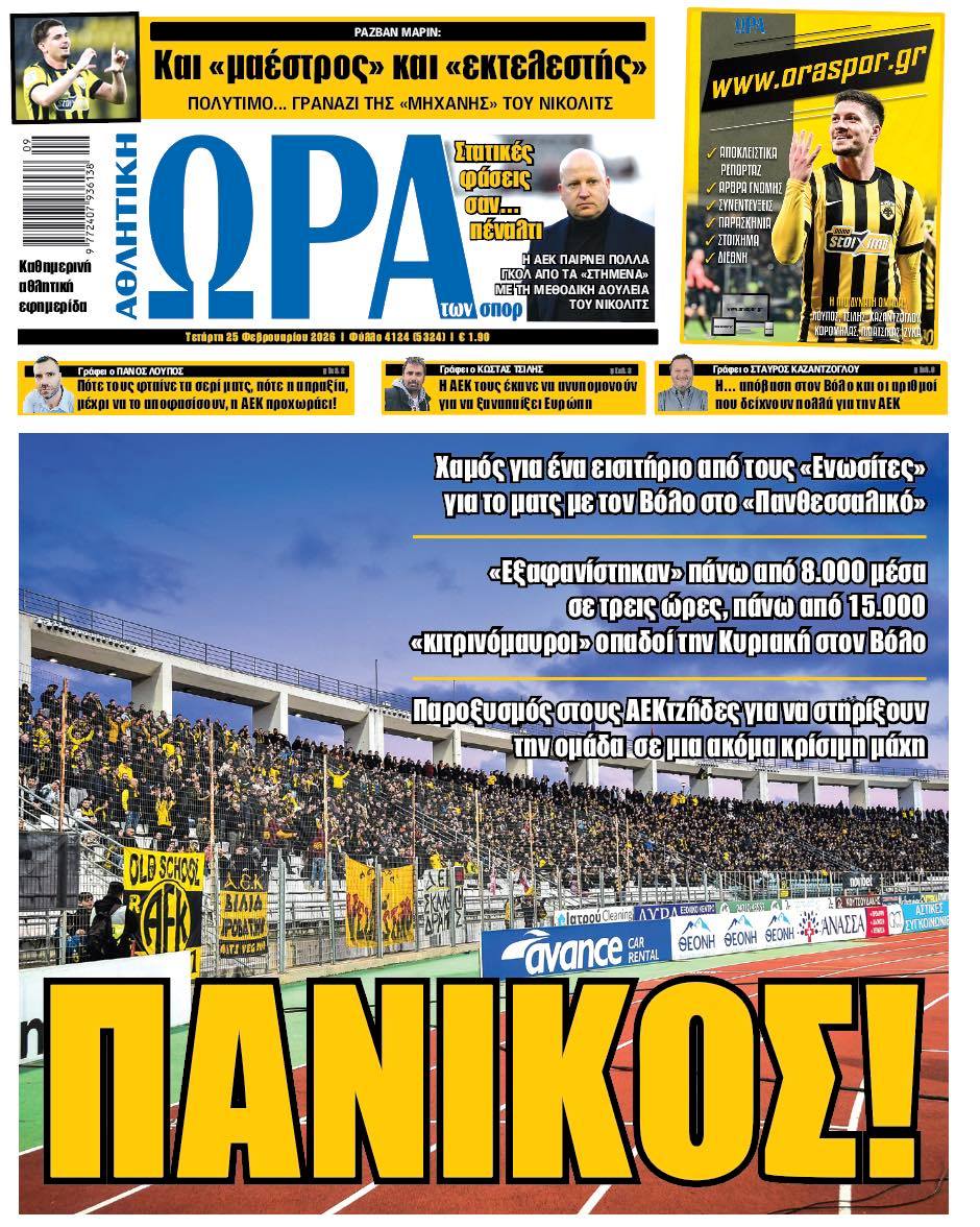 Πρωτοσέλιδα αθλητικών εφημερίδων για την Τετάρτη 25 Φεβρουαρίου 2026