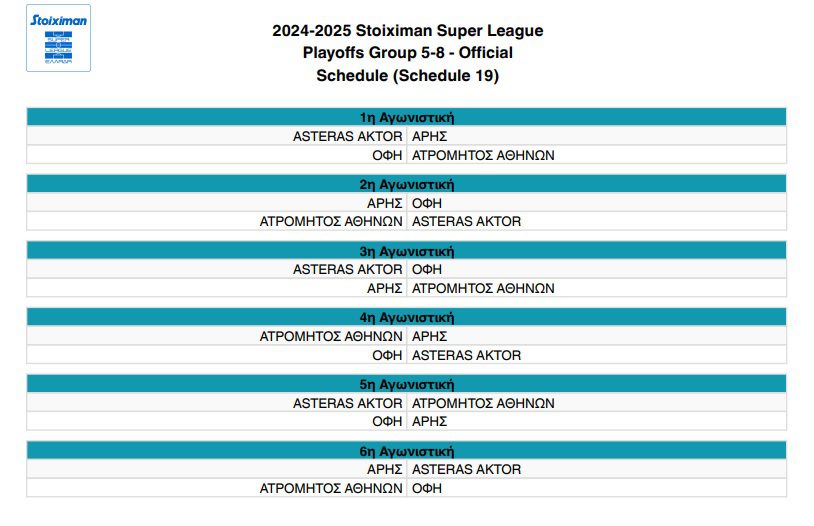 Ενώ υπάρχει και ο ΟΦΗ – Ατρόμητος στην πρώτη αγωνιστική των playoffs στο 5-8. Αξίζει να σημειωθεί ότι ομάδα που θα πάρει την πρώτη θέση στη διαδικασία αυτή, θα κερδίσει ευρωπαϊκό εισιτήριο εφόσον ΔΕΝ κατακτήσει το Κύπελλο κάποιος εκ των ΟΦΗ ή Αστέρας Τρίπολης.