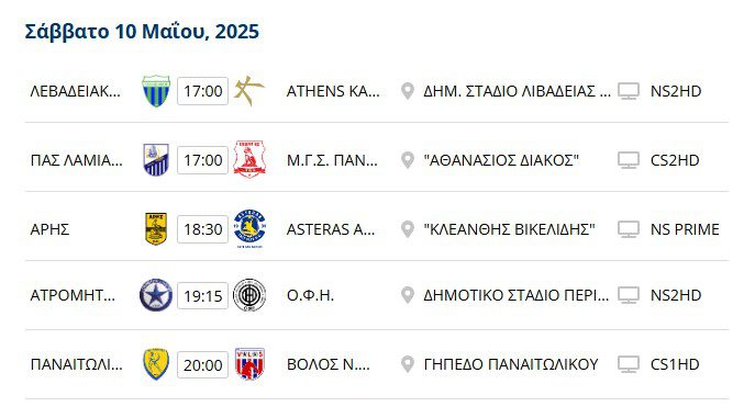 Η μάχη για την παραμονή κορυφώνεται με το βλέμμα στραμμένο σε Αγρίνιο και Λιβαδειά. Ο Παναιτωλικός υποδέχεται τον Βόλο στις 20:00 (CS1HD), με τους φιλοξενούμενους να χρειάζονται αποτέλεσμα για να μην κινδυνέψουν. Νωρίτερα, στις 17:00, η Athens Kallithea δοκιμάζεται στη Λιβαδειά απέναντι στον Λεβαδειακό (NS2HD), ψάχνοντας νίκη και στραβοπάτημα του Βόλου για να καταφέρει να τον ξεπεράσει στα υπόλοιπα.