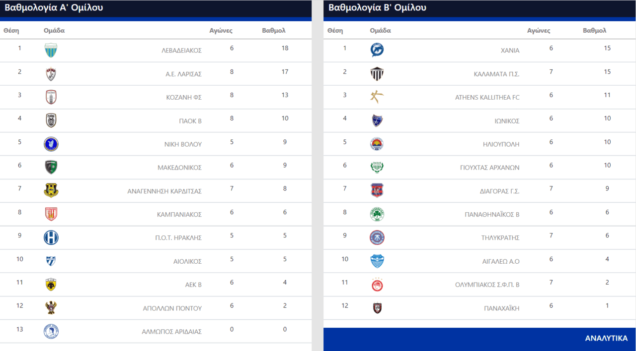 Τους έπιασε στη βαθμολογία η Κοζάνη έχοντας παιχνίδι λιγότερο. Η τελευταία πέρασε από τη Θεσσαλονίκη επικρατώντας με 1-0 του Καμπανιακού. Το γκολ σημείωσε ο Καλλέργης και με αυτό η ομάδα του επέστρεψε στα τρίποντα. Δεν κατάφερε κάτι αντίστοιχο και η ΑΕΚ’ Β. Ίσα ίσα που λίγο έλειψε να γίνει η πρώτη ομάδα που χάνει από τον Απόλλωνα Πόντου. Στο τέλος ισοφάρισε σε 2-2.