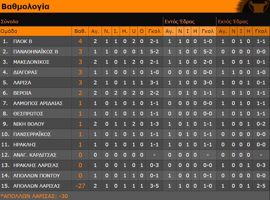 Τέλος, για τον άλλον όμιλο του πρωταθλήματος ο Απόλλων Λάρισας μετά την πεντάρα απέναντι στον Παναθηναϊκό Β’, συνήλθε. Νίκησε με 1-0 τον Μακεδονικό χάρις σε γκολ του Σιατραβάνη στο 80′. Οι φιλοξενούμενοι θα μπορούσαν να έχουν προηγηθεί στο 55′, όταν ο Σαραντίδης νικήθηκε από τον Μέλι. Να σημειωθεί πως στο 90′ αποβλήθηκε ο Μπαλογιάννης για τους Θεσσαλούς.