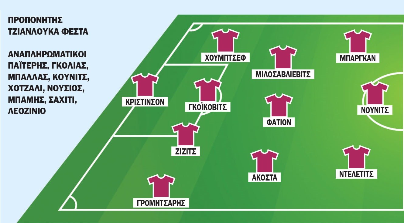 Στο µυαλό του προπονητή είναι πολλά όσον αφορά το στήσιµο της οµάδας. Ωστόσο το 4-2- 3-1 είναι το επικρατέστερο. Λογικά ο Μπάρκας θα είναι στον «άσο», µε τον Τσιντώτα ωστόσο, να διεκδικεί ξανά θέση βασικού.
