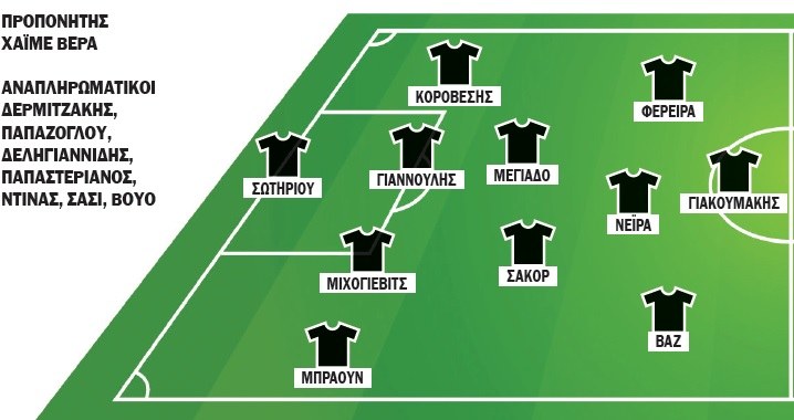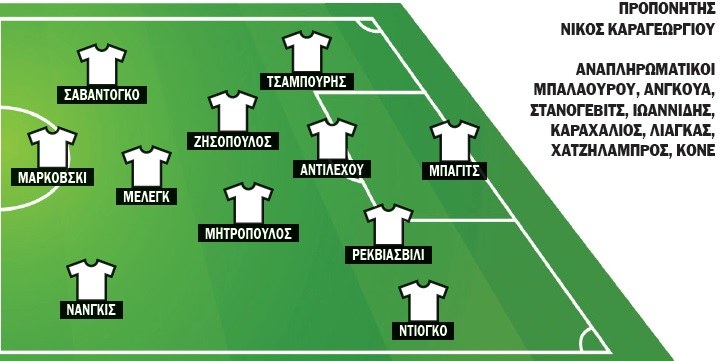 Για τον Νίκο Καραγεωργίου, οι απουσίες του είναι ο τιμωρημένος Παντελιάδης και ο ανέτοιμος Γιακουμάκης. Στο αριστερό άκρο της άμυνας θα αγωνιστεί ο Ντιόγκο, ενώ στη μεσαία γραμμή αν δεν αγωνιστεί ο Κονέ, ως παρτενέρ του Ζησόπουλου θα παίξει ο Μητρόπουλος.