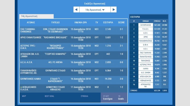 Ο Ολυμπιακός βρίσκεται στην κορυφή του πίνακα με τα εισιτήρια της Super League ύστερα από 14 αγωνιστικές.