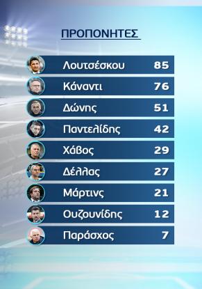 H ιστοσελίδα novasports.gr προκάλεσε ψηφοφορία των ομάδων της Super League για τον κορυφαίο προπονητή του πρωταθλήματος με τον Ραζβάν Λουτσέσκου να είναι στην πρώτη θέση, δεύτερο τον Κάναντι και τρίτο τον Γιώργο Δώνη.