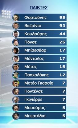 Μεταξύ των ποδοσφαιριστών, λοιπόν, ο Φορτούνης συγκέντρωσε 98 βαθμούς έναντι 93 του Αντελίνο Βιεϊρίνια. Τρίτος στην ψηφοφορία ο Ευθύμης Κουλούρης με 44.