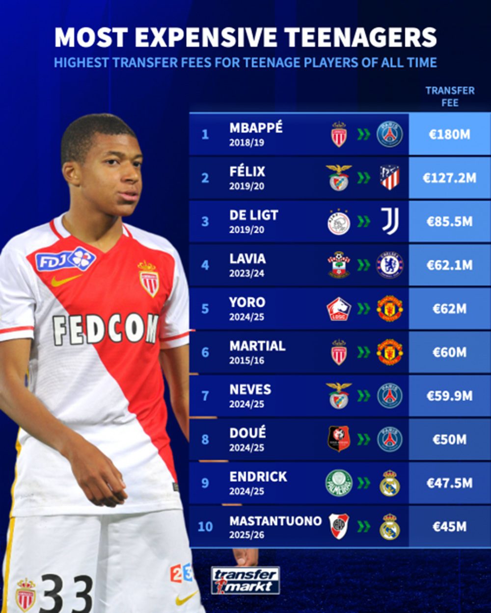 Στην κορυφή εξακολουθεί να δεσπόζει ο Κιλιάν Εμπαπέ, ο οποίος το 2018 μετακινήθηκε από τη Μονακό στην Παρί Σεν Ζερμέν έναντι 180 εκατ. ευρώ, σε μία μεταγραφή-ορόσημο.