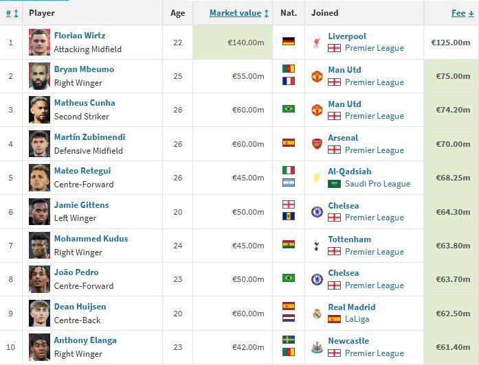Στην κορυφή βρίσκεται ο Φλόριαν Βιρτς, που πήρε μεταγραφή από τη Λεβερκούζεν στη Λίβερπουλ έναντι 125 εκατ. ευρώ, με τον 22χρονο μεσοεπιθετικό να θεωρείται ήδη ως επένδυση για το παρόν και το μέλλον.