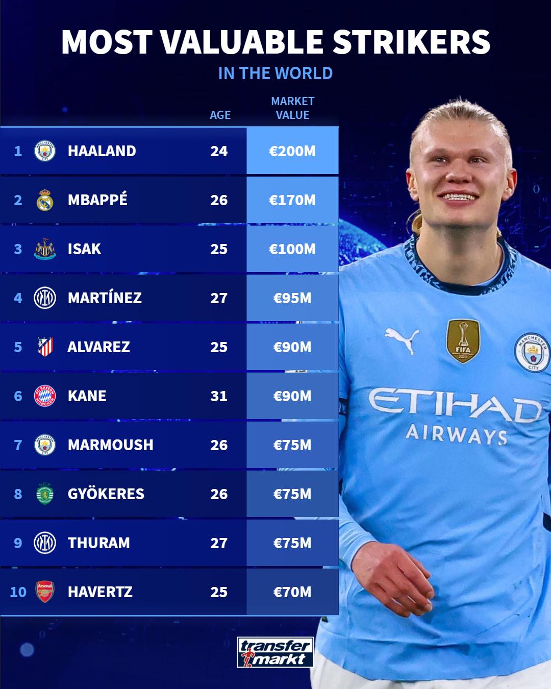 Η λίστα συμπληρώνεται με πιο «ήσυχες» παρουσίες, όπως οι Μαρμούς, Γκιόκερες και Τουράμ (όλοι στα 75 εκατ.), ενώ στη δέκατη θέση βρίσκουμε τον Κάι Χάβερτς με 70 εκατομμύρια.