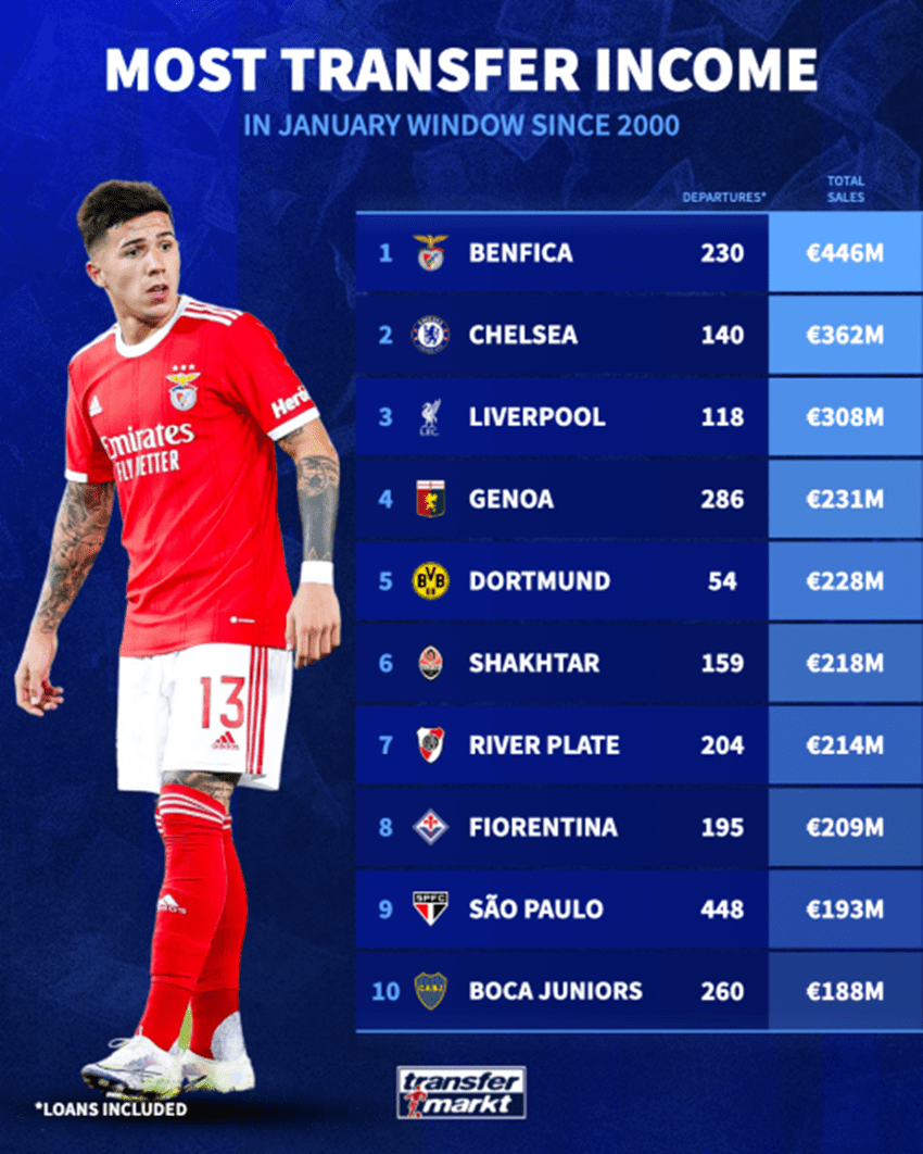 Η Μπενφίκα λοιπόν αναδεικνύεται ως η κορυφαία ομάδα με τα περισσότερα έσοδα από μεταγραφές κατά τη χειμερινή μεταγραφική περίοδο από το 2000.