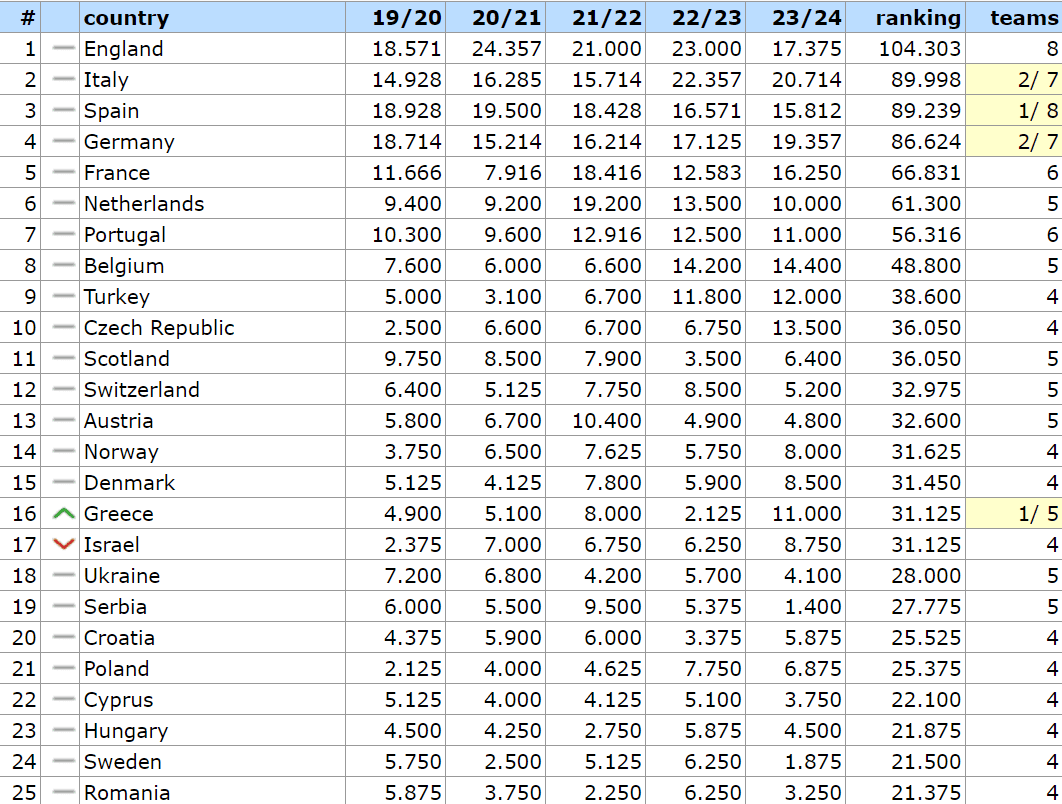 Με αυτή τη νίκη οι «ερυθρόλευκοι» έδωσαν άλλους 400 βαθμούς στη χώρα μας. Ωστόσο, εκτός από αυτούς, πήραμε και άλλους 200 λόγω της πρόκρισης του Ολυμπιακού. Έτσι ήρθε η προσπέραση. Η Ελλάδα έβαλε από κάτω της το Ισραήλ και συνεχίζει.