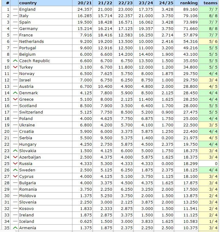 Πλέον η ανάγκη για βαθμούς γίνεται επιτακτική, με δεδομένο οτι πίσω μας «καραδοκεί» η 16η Σκωτία με 28.000 βαθμούς και 5/5 ομάδες να συνεχίζουν στα ευρωπαϊκά Κύπελλα, ενώ 27.475 βαθμούς έχει η Ελβετία που επίσης έχει πέντε ομάδες στην Ευρώπη.
